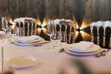 Close-up of table setting for holiday. Wedding table with cutlery, decorated for guests in the luxury restaurant.