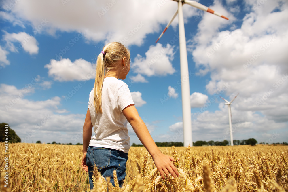 Back view little cute happy blond caucasian girl enjoy walking ripe wheat ear field against wind mill turbine farm on warm sunny summer day. Child freedom future clean energy environment concept