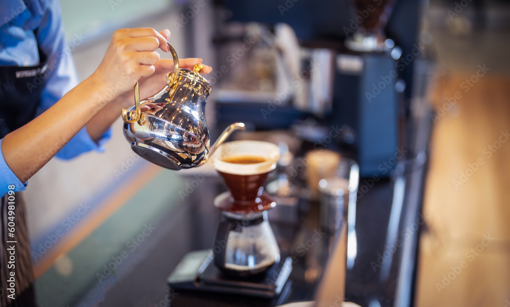 Professional Barista's hand making pouring hot water to coffee drip bag in coffee shop.