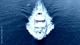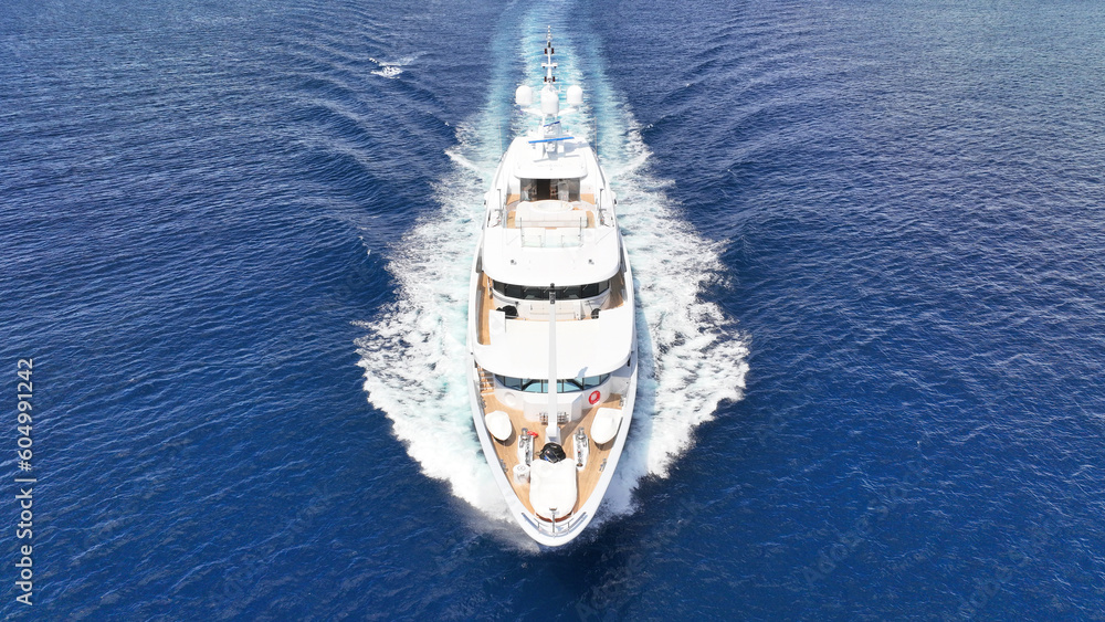 Aerial drone photo of luxury yacht cruising in deep blue Aegean sea