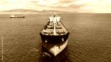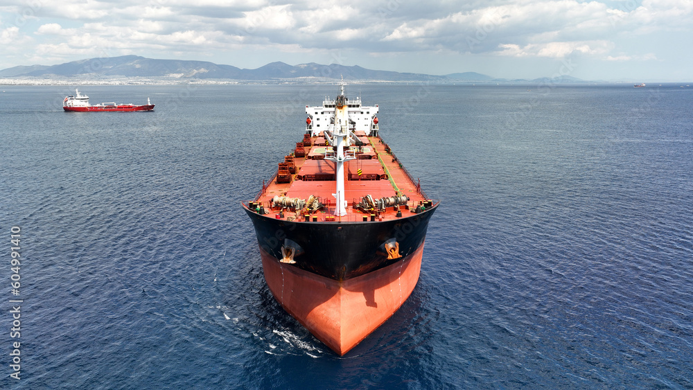 Aerial drone photo of huge bulk carrier tanker anchored in deep blue Aegean sea