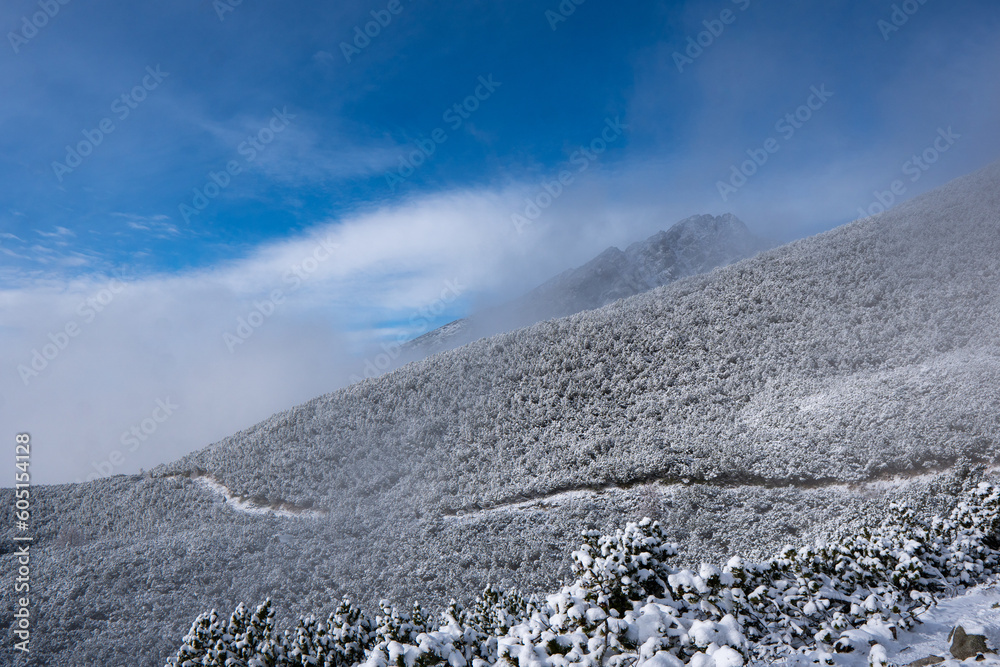 Majestic white spruces glowing by sunlight. Picturesque and gorgeous wintry scene. Location place Carpathian national park High Tatras, Slovakia Europe. Blue toning. Happy New Year! Beauty world.