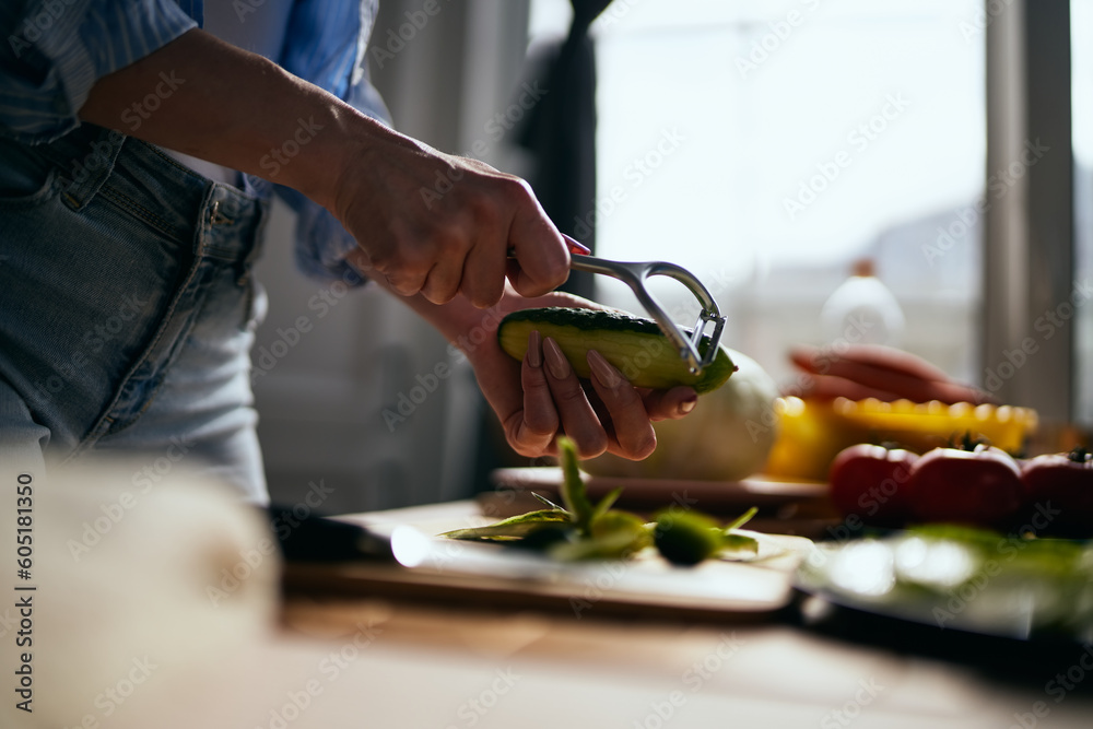 Female person peeling off a cucumber with a peeler tool in a home kitchen in the morning. Woman preparing fresh green salad for lunch