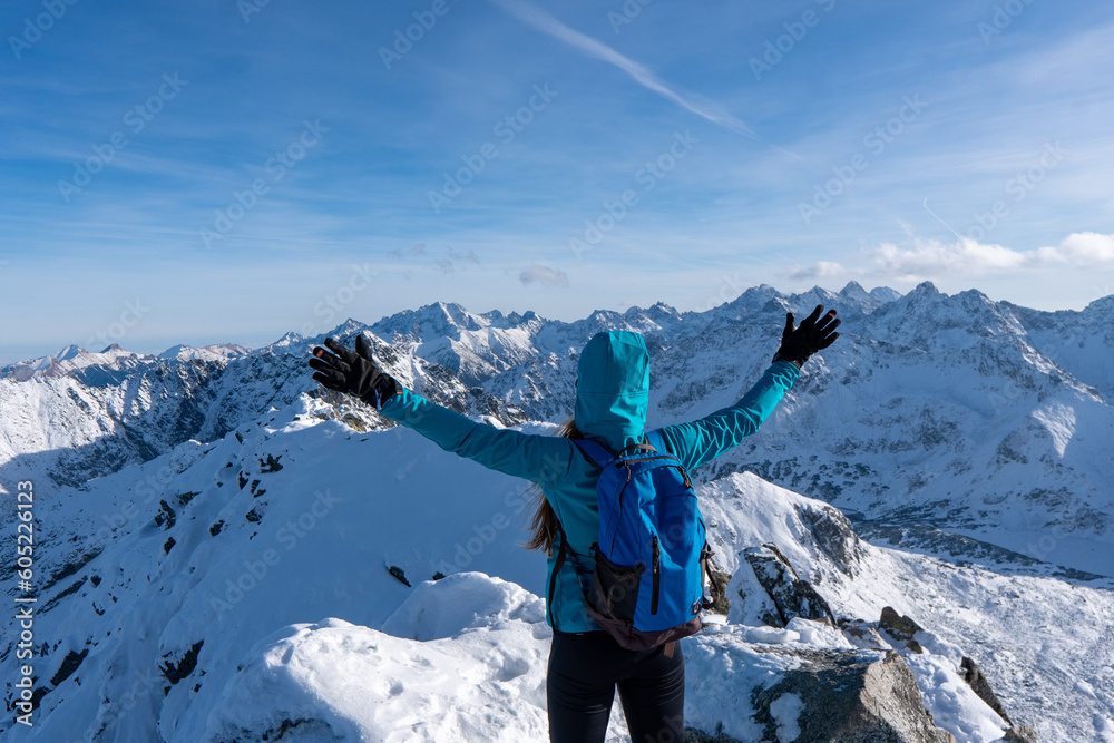 Happy slim girl is standing at winter mountains with raised arms and enjoying the view. High Tatras Poland and Slovakia