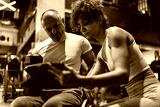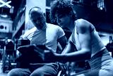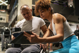 A determined individual in a wheelchair, working out in the gym with the guidance of a dedicated female fitness trainer who using a tablet to show a weekly workout plan.