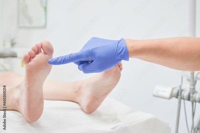 Chiropodist doctor points the foot of a patient who needs to remove a callosity (hyperkeratosis) from the sole of the foot. Scenes from a podiatry clinic.