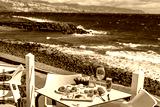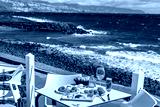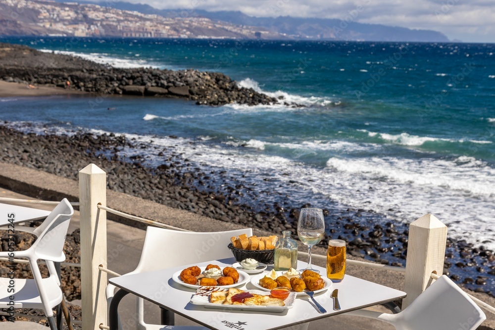 Close-up shot of fried fast food and French toast on a white table with a background of a sea