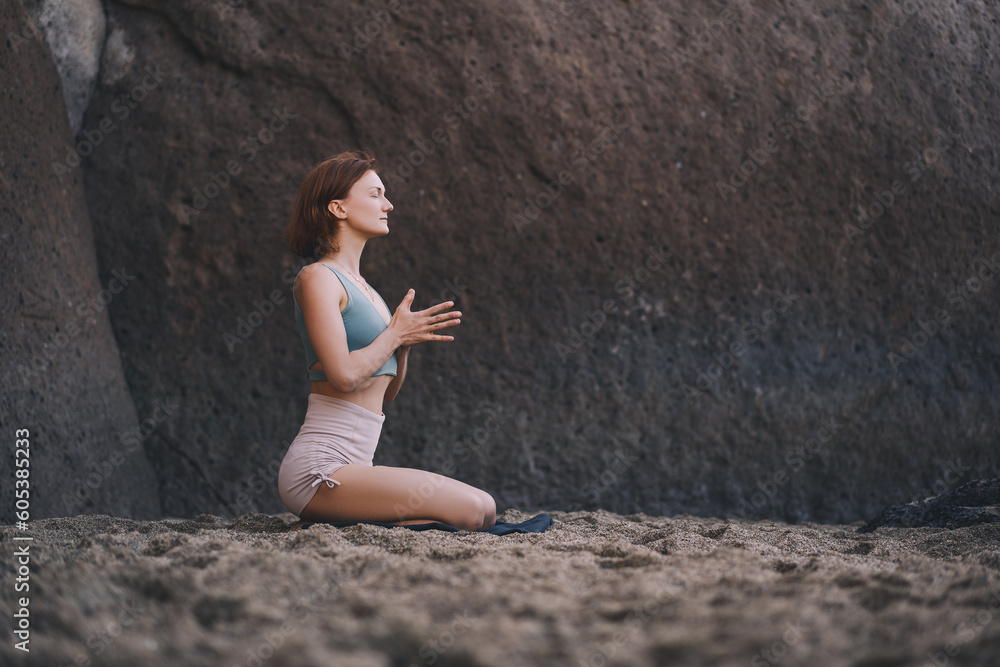 Woman doing yoga practice and meditating on the beach