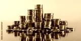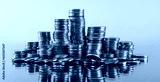 Stacks of coins in reflection on a grey background