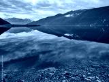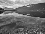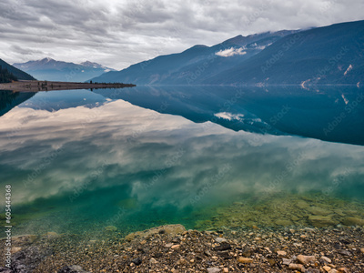 The calm surface of a clear lake surrounded by mountains in British Columbia