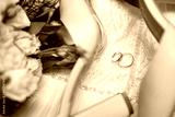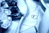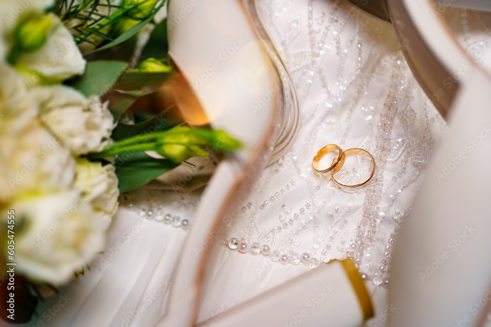 Two gold wedding rings and shoes on a beaded dress. Jewelry for bride and groom.