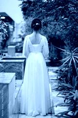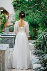 without a face. Rear view of a dark-haired woman in a wedding dress.