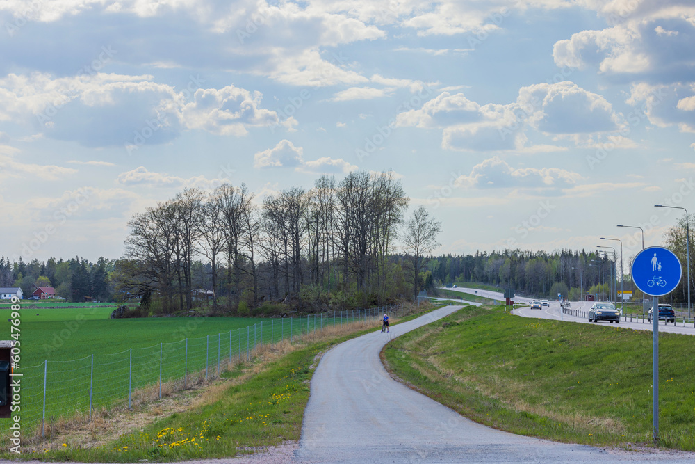 Beautiful countryside landscape view. Road sign for pedestrians and bicycles on front. Sweden. Europe.