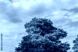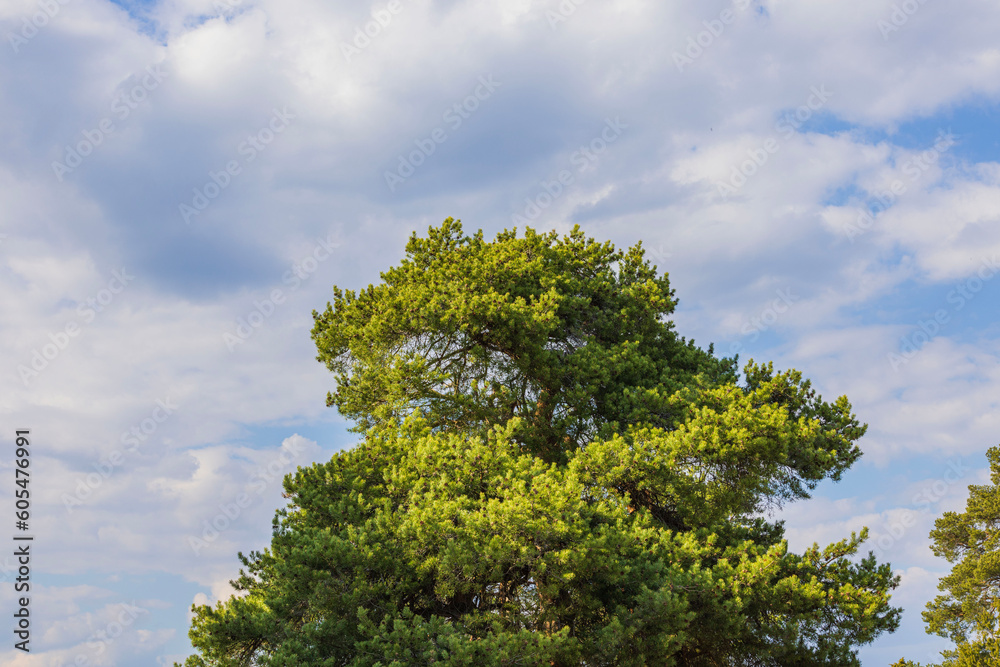 View of top of pine tree against blue sky with white clouds. Sweden.