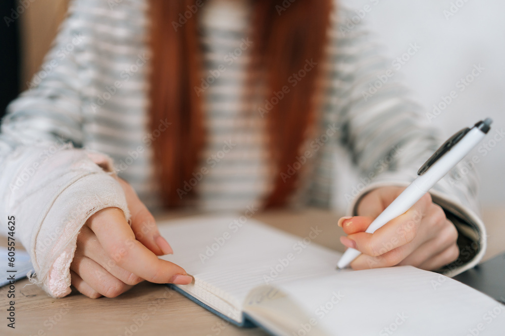 Close-up cropped shot of unrecognizable injured young woman with broken right hand wrapped in white gypsum bandage writing on paper notepad sitting at table. Concept of insurance and healthcare
