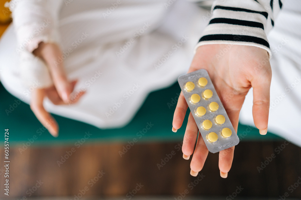 Close-up top view of unrecognizable young woman with broken right hand wrapped in gypsum bandage holding blister packs of pills sitting on couch. Concept of social security and health insurance.
