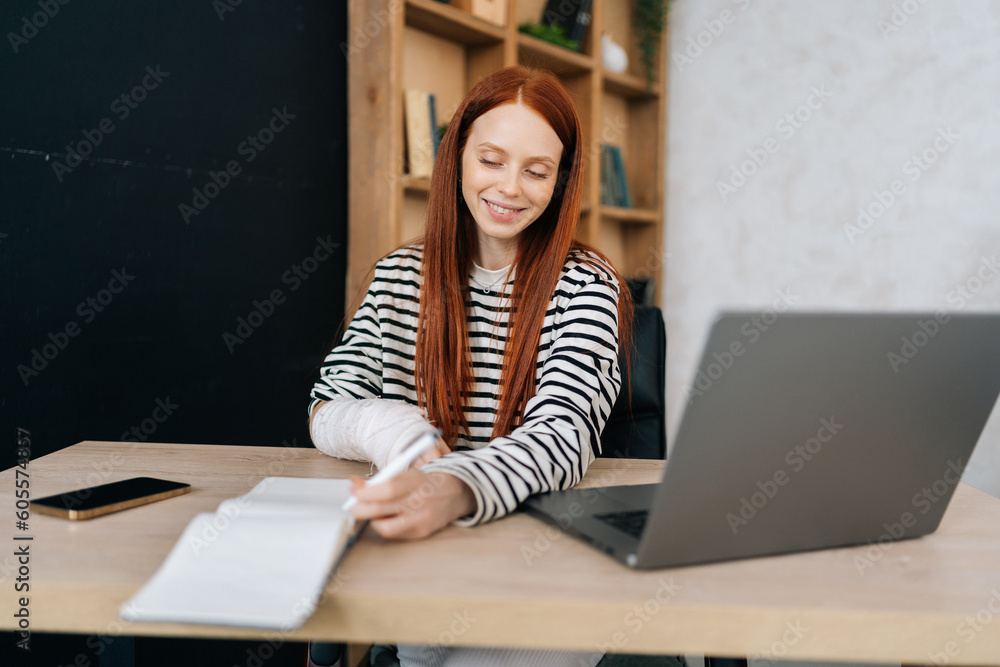 Happy smiling young female student with broken right hand wrapped in white gypsum bandage working remotely with paper documents and laptop computer, smiling looking away, sitting at table.