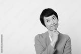 熟考する賢いカジュアルな服の成熟した日本人女性