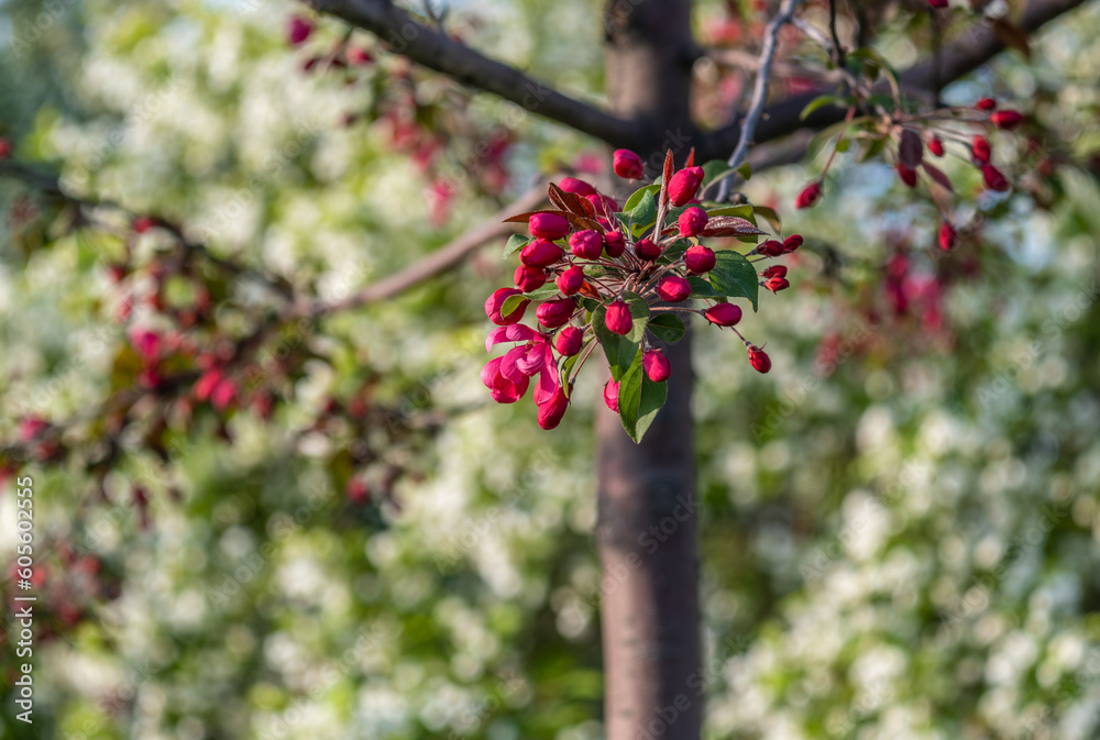Red flowers on the branches of a blooming apple tree on a spring day.