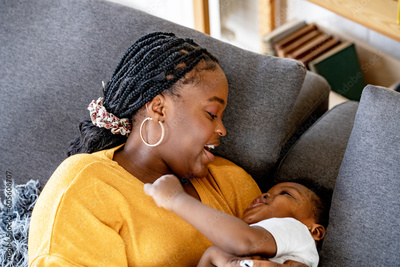 Cheerful African-American mother and son cuddling, laughing, and having fun at home. Family bonding time