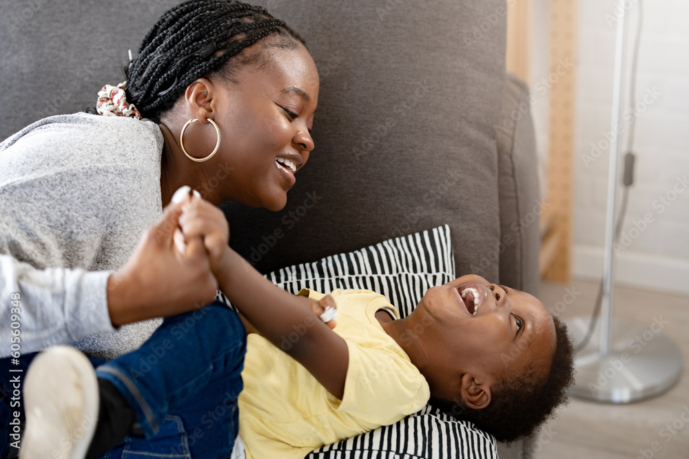 Cheerful African-American mother and son cuddling, laughing, and having fun at home. Family bonding time