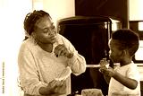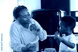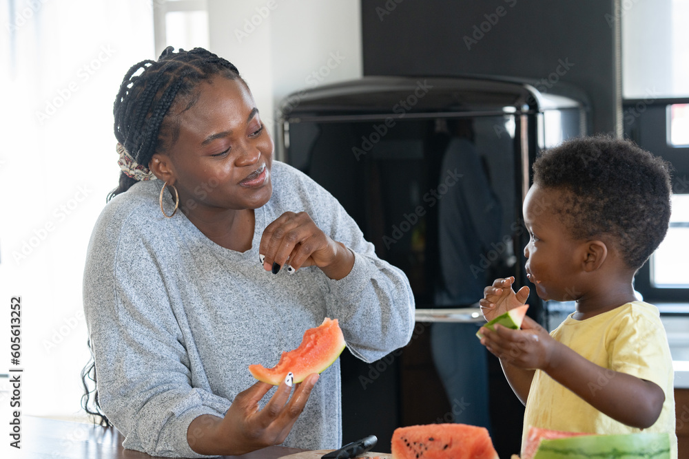 Cheerful African-American mother and son eating a tasty watermelon at home. Flavors of summer