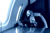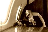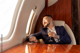 asian businessman in suit and glasses with glass of champagne flies in private luxury jet, korean entrepreneur