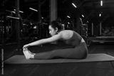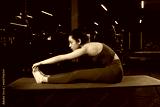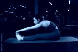 athletic woman in red sportswear sitting on yoga matte in black gym and warming up, girl doing yoga and stretching