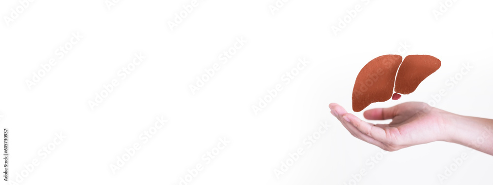 Wide screen of Hand's holding liver, concept of liver and organ donation or charity, hospital, anatomy, diagnosis, cancer, disease, donor, health care of life, insurance background with copy space