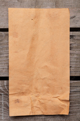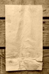 Old yellowed crumpled paper. Blank sheet of paper on vintage wooden back.