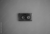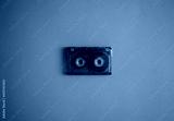 Audio cassette in the middle on an orange background, top view.