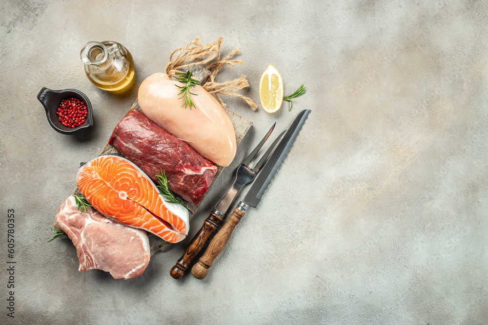 raw meat assortment steaks beef, pork, chicken on light background. place for text, top view