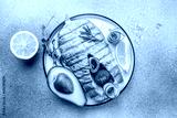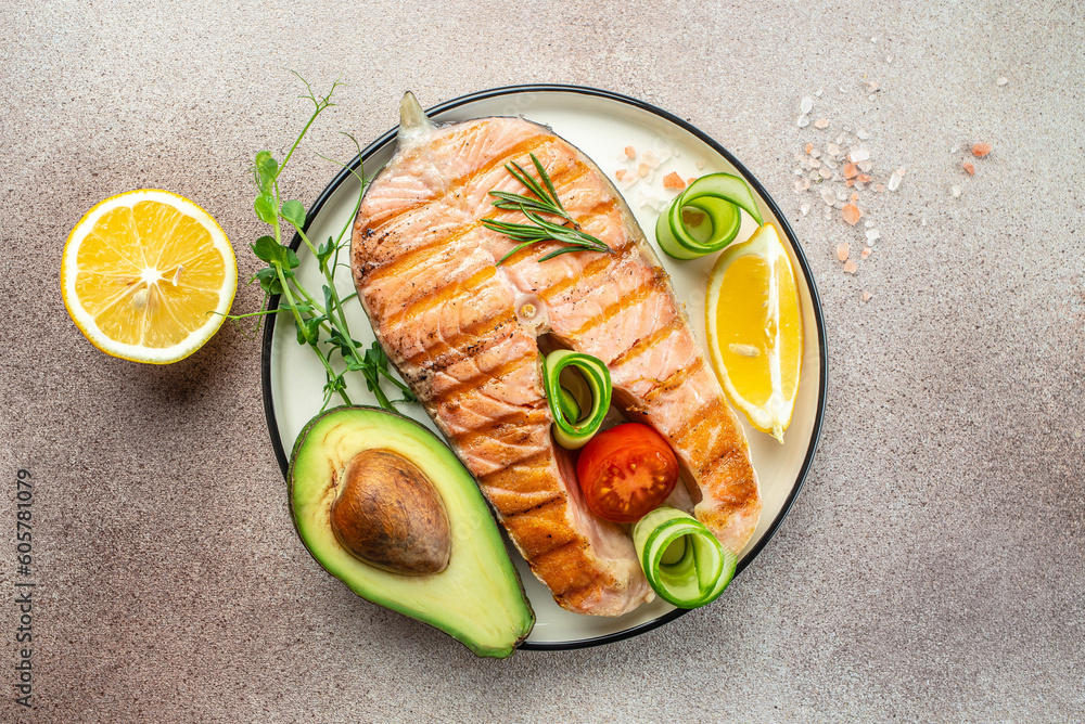 Dish grilled salmon steak with avocado and fresh vegetable salad. Keto diet concept healthy food, Healthy fats, clean eating for weight loss. top view