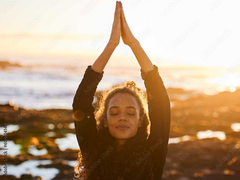 Woman, beach yoga and sunset with pray hands, eyes closed and peace of mind in summer sunshine. Girl, zen meditation and mindfulness for health, wellness and exercise by ocean with stretching outdoor