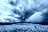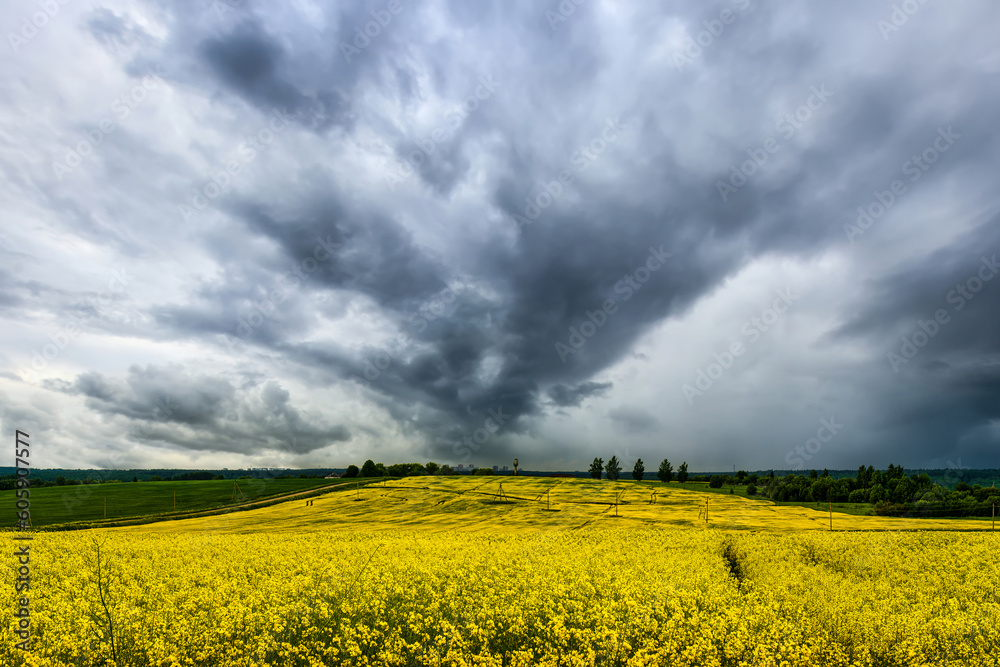 An approaching thunderstorm in a flowering rapeseed field.
