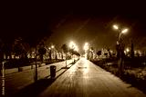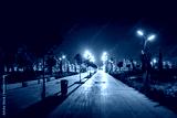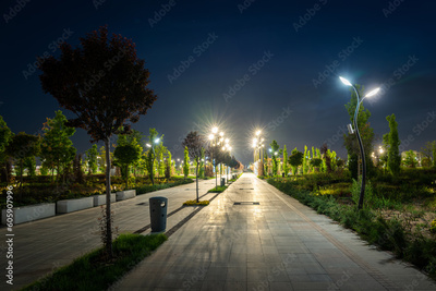 City night park in early summer or spring with pavement, lanterns, young green lawn and trees.