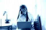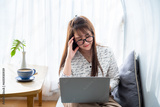 Stressed freelance people business asian female Having Headache While Working Using laptop computer with coffee cup and smartphone at window in coffee shop like the background