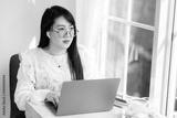 Happy of asian freelance people Businesswoman wearing wireless earphones casual working with laptop computer with a coffee cup mug,Notebook and smartphone at the cafe,Business Lifestyle communication