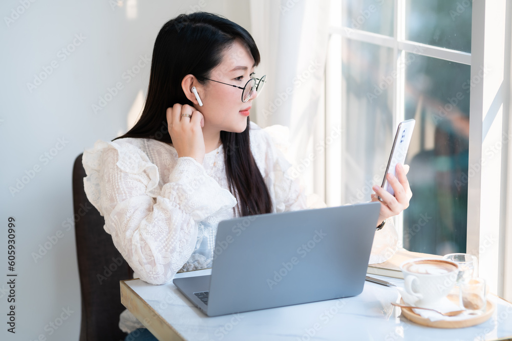 Happy smiley face asian freelance people Businesswoman wearing wireless earphones using smartphone video call camera and talking while casual working with laptop computer at the cafe,Lifestyle