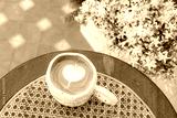 Hot coffee latte with latte art milk foam in white stone patterned cup mug on wood desk on top view. As breakfast In a coffee shop at the cafe,during business work concept