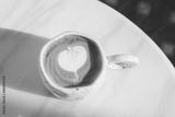 Hot coffee latte with latte art milk foam in white stone patterned cup mug on wood desk on top view. As breakfast In a coffee shop at the cafe,during business work concept