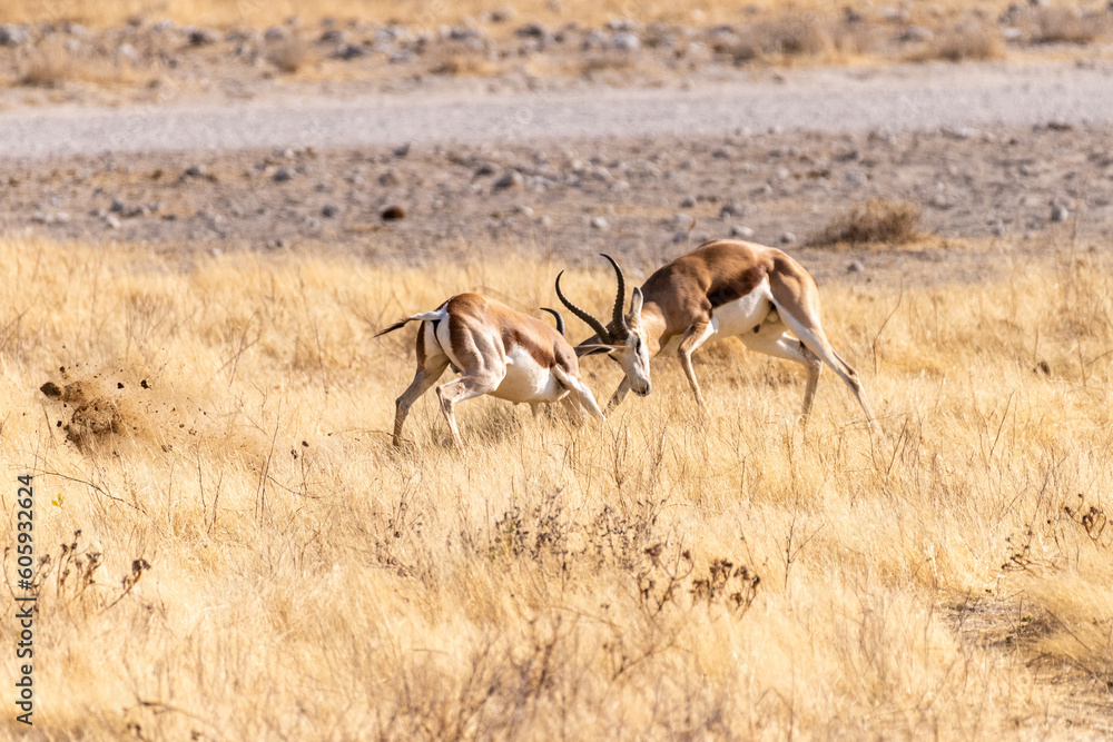 Telephoto shot of two Impalas - Aepyceros melampus- engaging in a head-to-head fight.