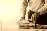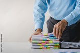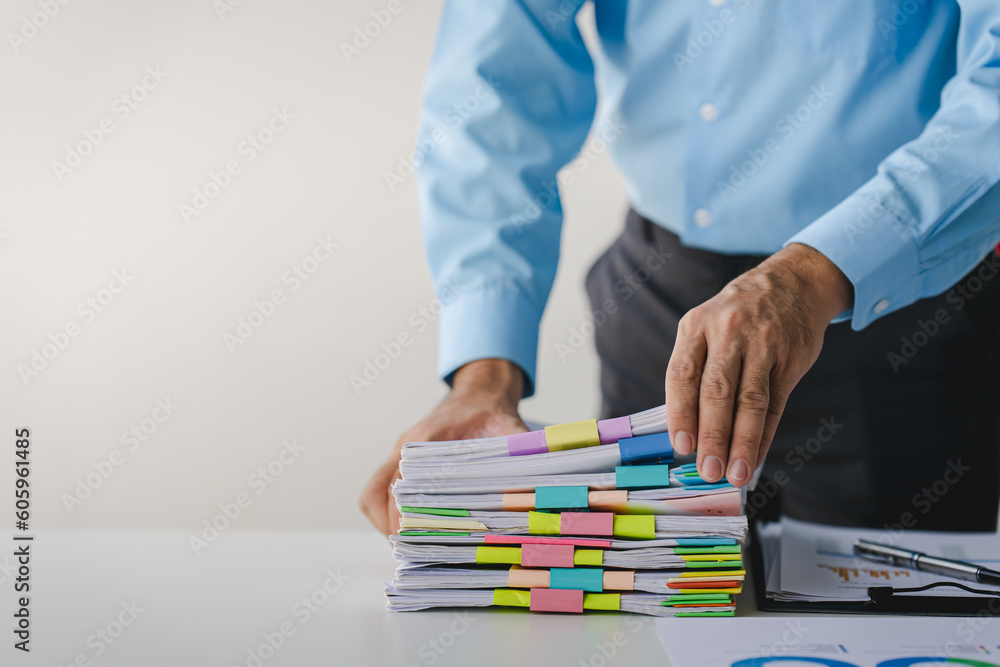 Businessman working on stacks of documents to search for information and check documents on office desk