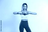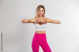 Happy beautiful young fitness girl with a smile in fashionable sportswear holds a baguette bread on a white background. Healthy food, baking and diet