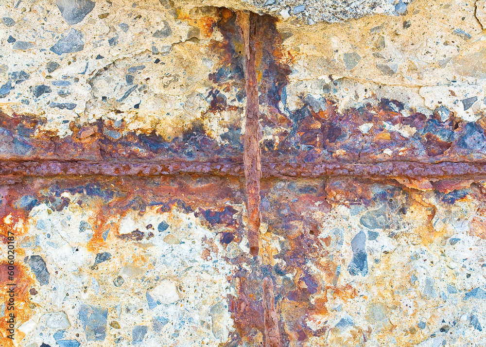 Old reinforced concrete wall without concrete cover protection due oxidation with damaged and rusty metallic reinforcement