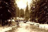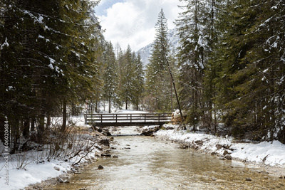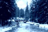 View of a Rienz river in a snowy winter day; trees and bridge; Toblach (Dobbiaco), Bolzano, Italy; Dolomites