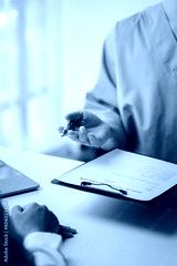 Doctor talking to patient and filling patient history, examination, treatment, medical and health concept.
