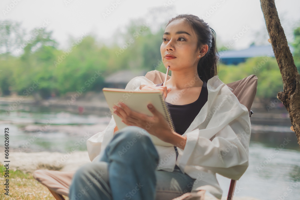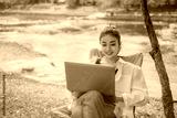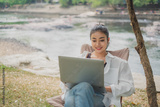 A professional businesswoman is working or using laptop or notebook while on vacation, trip or traveling. Concept working space outdoor. Nature journey, wireless freedom work new normal lifestyle work