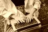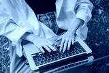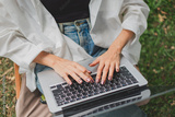 Close up of Hand is working or using laptop or notebook while on vacation, trip or traveling. Concept working space outdoor. Nature journey, wireless freedom work new normal lifestyle work. Technology