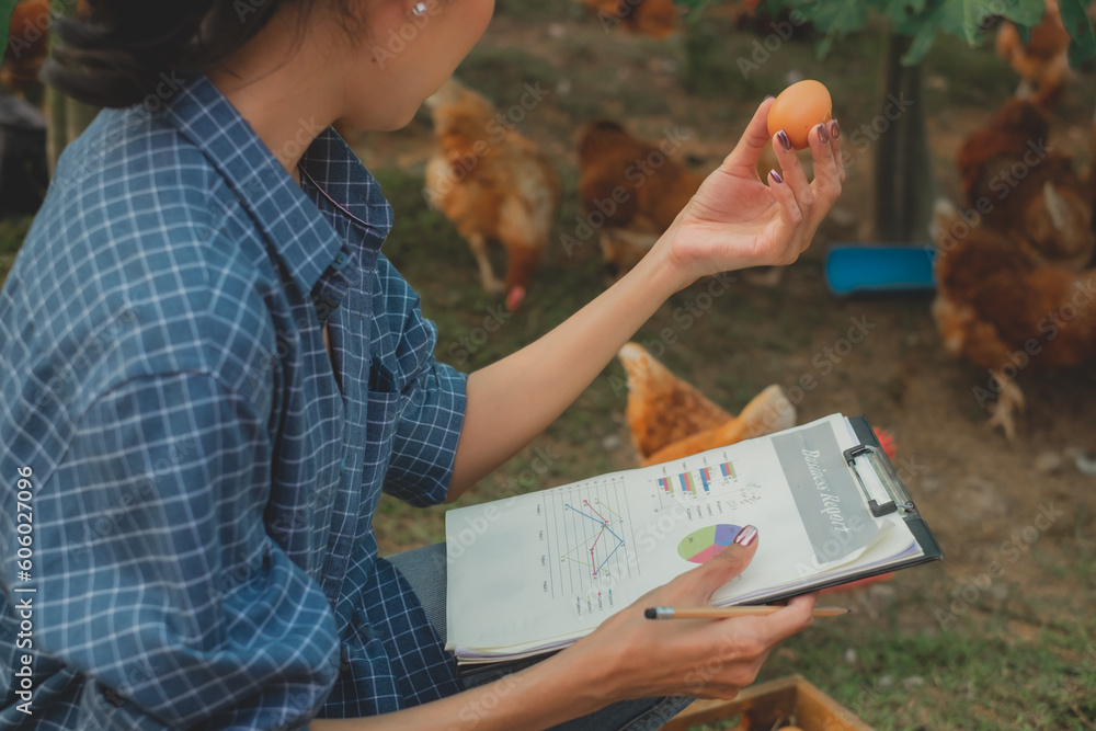 Close up of Female farmer is checking the quality of an egg. Concept of organic hen or chicken quality control, examining, study and collecting data to improve an organic business.